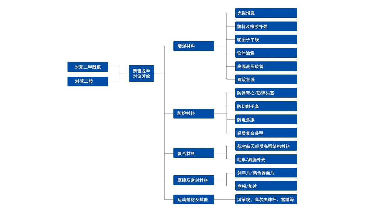 泰普龍®對位芳綸產(chǎn)品經(jīng)過幾年來的市場推廣,已經(jīng)得到越來越多國內(nèi)外用戶的認可,開始在膠管骨架、增強基布、輪胎簾子布、盤根密封、光纜增強等領(lǐng)域得到應(yīng)用,并逐步向其它高端應(yīng)用領(lǐng)域延伸。